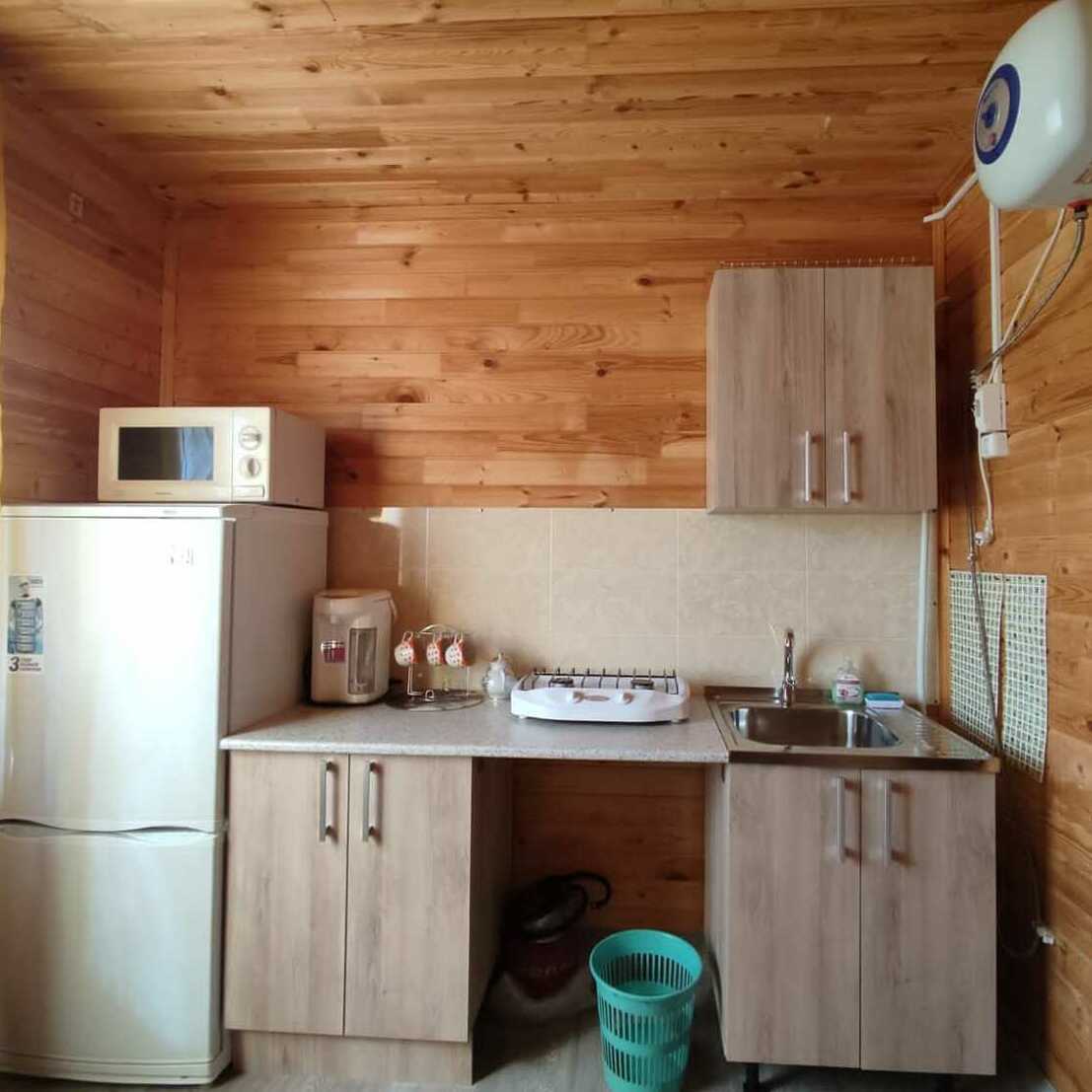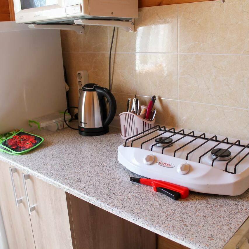 Кухня: кухонная мебель, холодильник, газовая плита, микроволновая печь, чайник, посуда, вся необходимая столовая утварь, мойка.